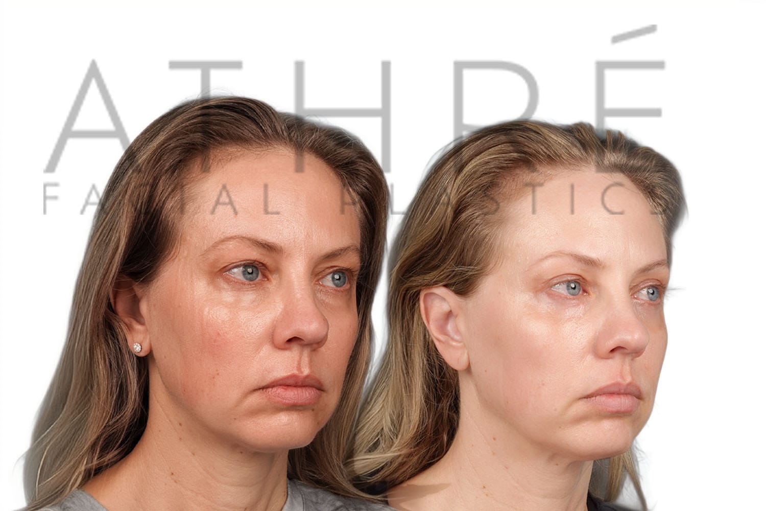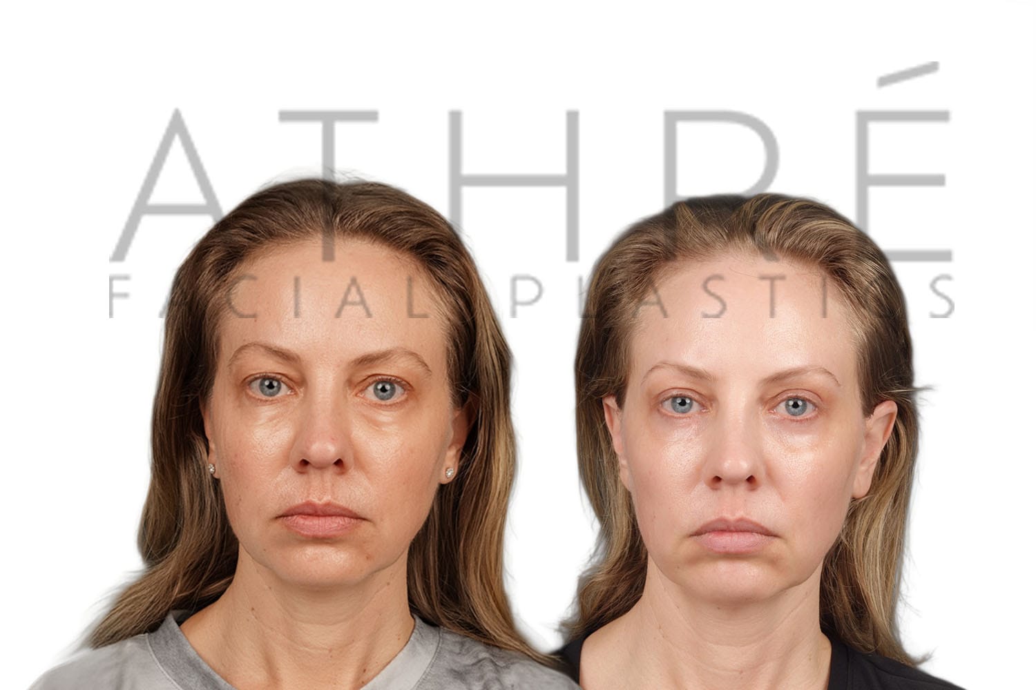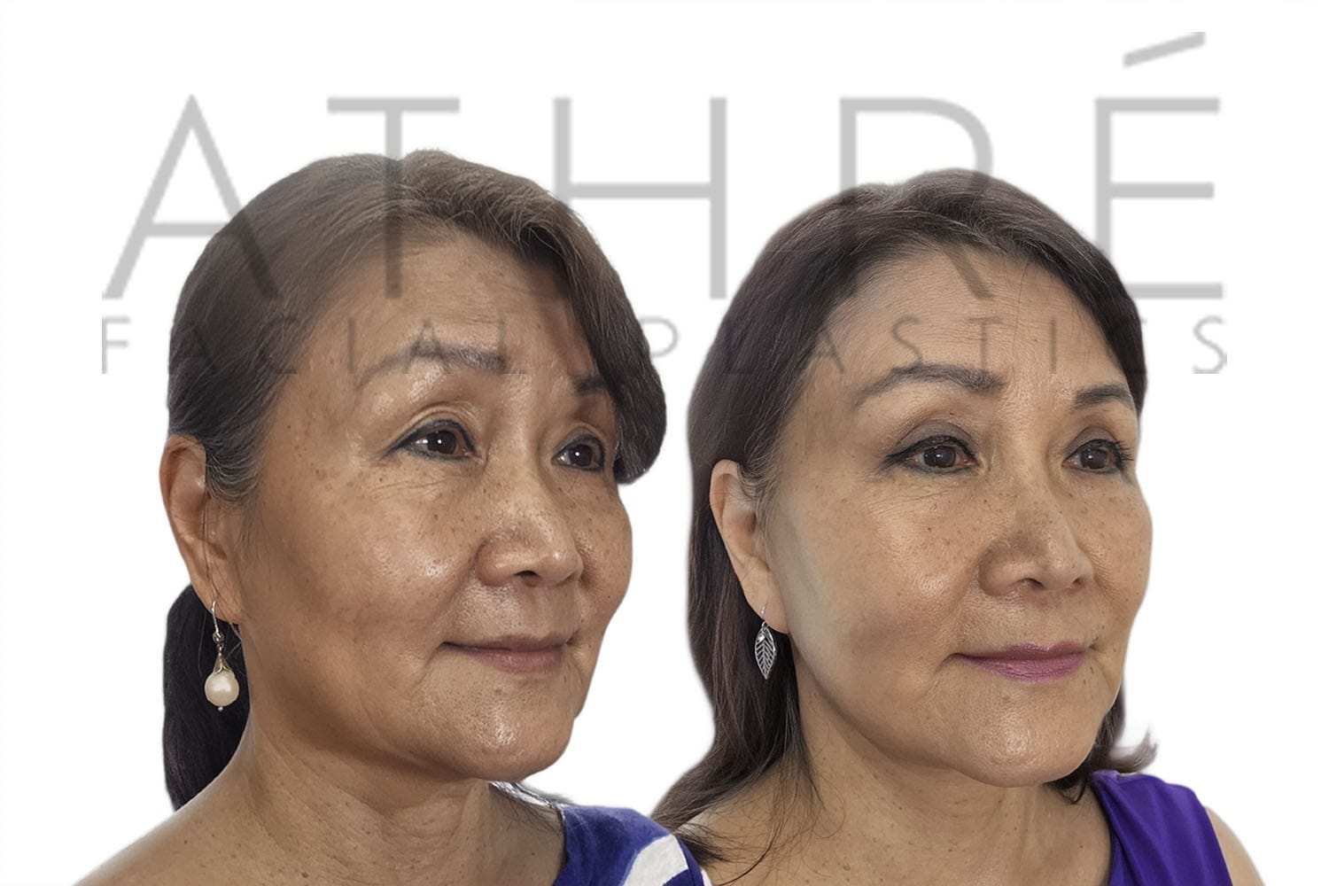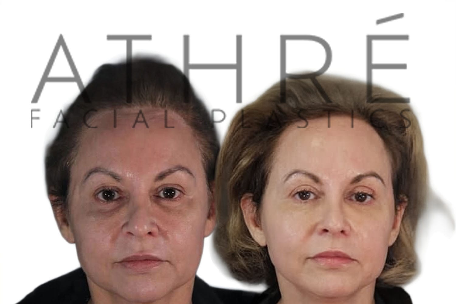 Female patient after upper blepharoplasty, lower transconjuctival blepharoplasty, midface lift, and autologous fat transfer.