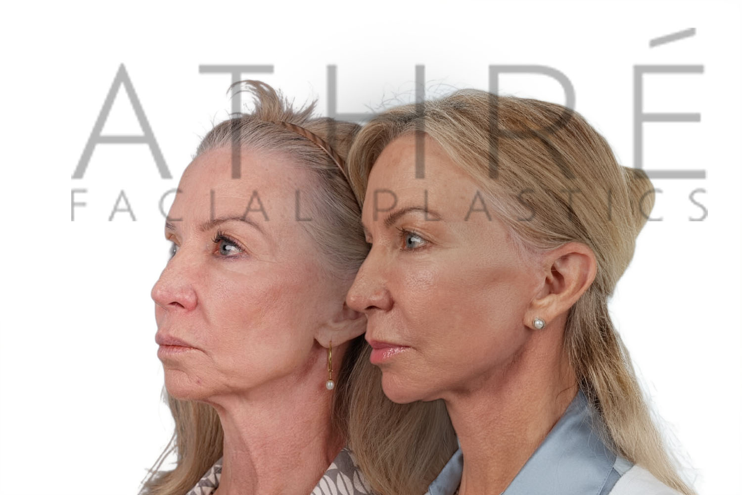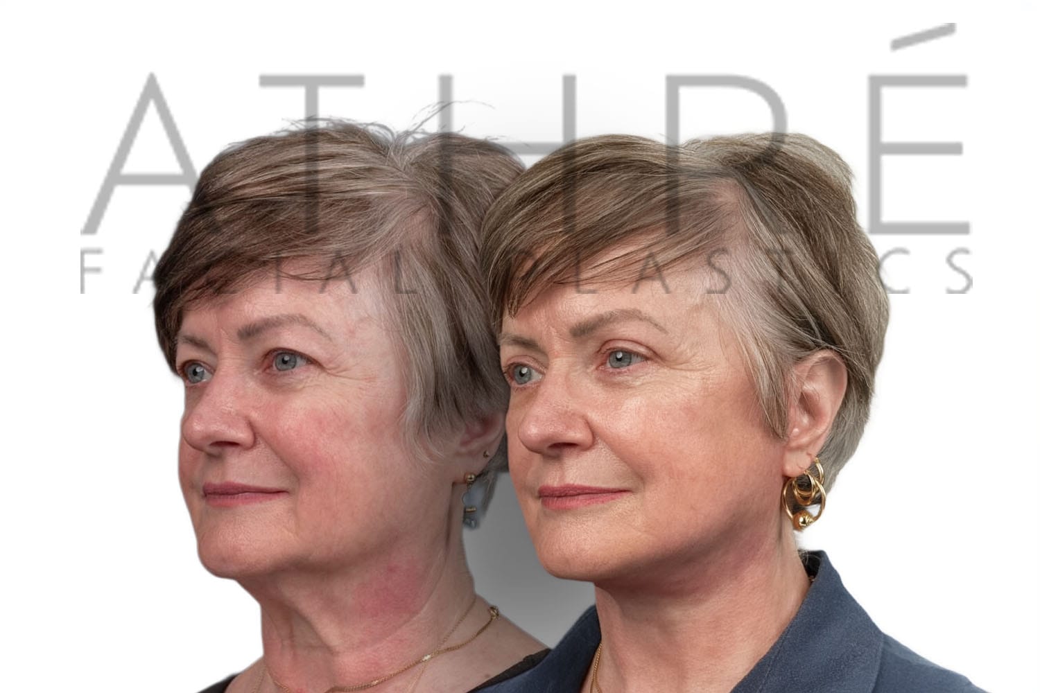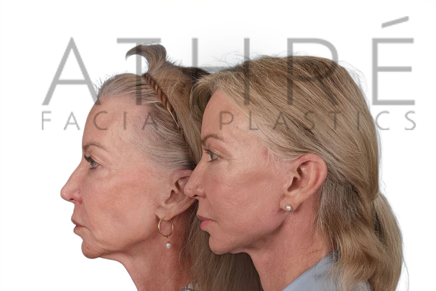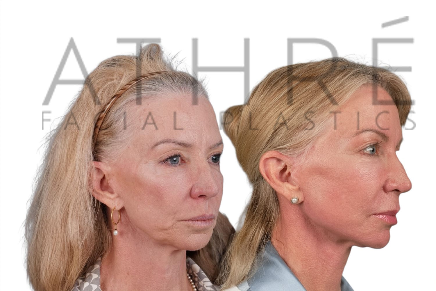 Female patient after deep plane facelift, deep neck lift, upper blepharoplasty, and autologous fat transfer. Local anesthesia with oral sedation.