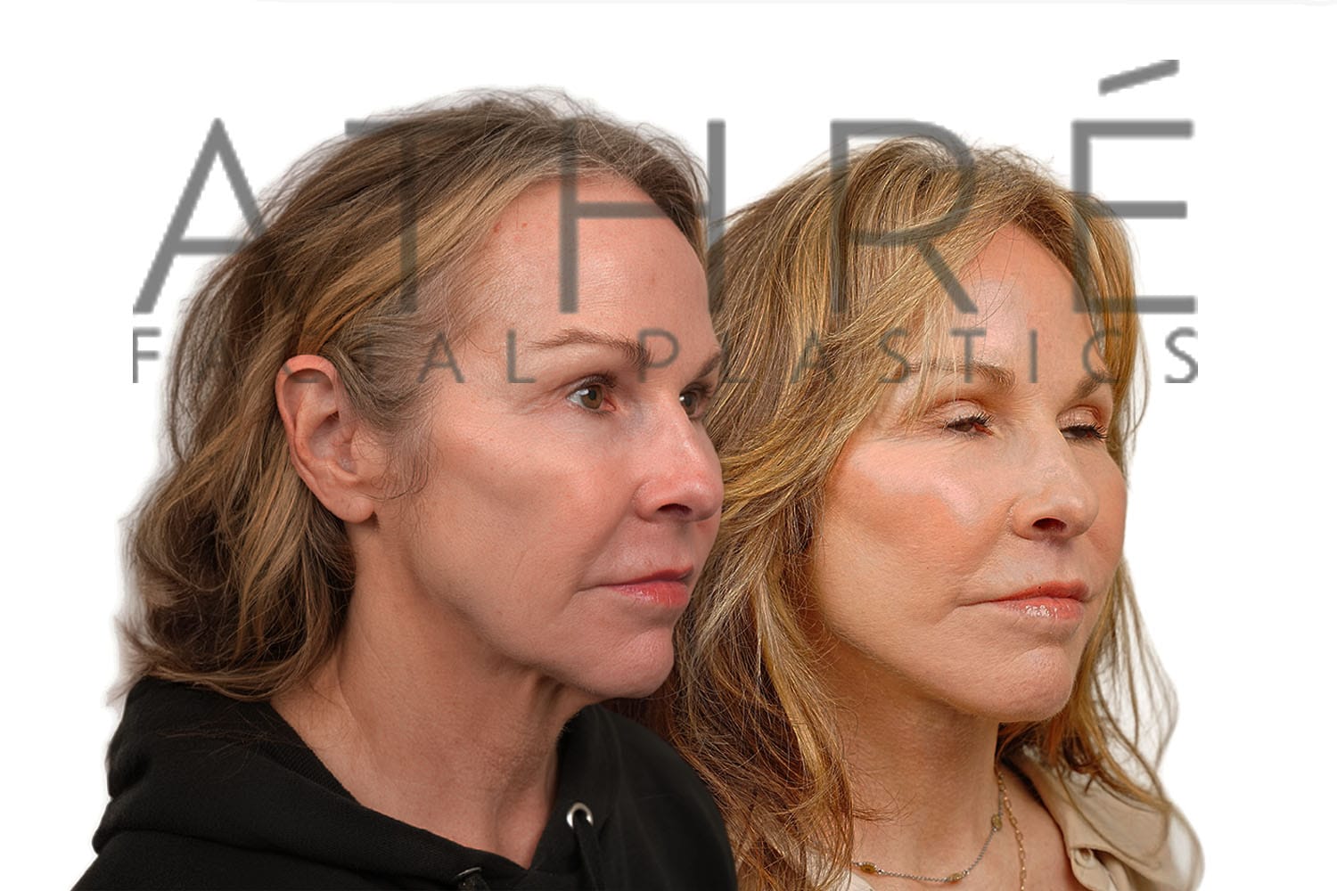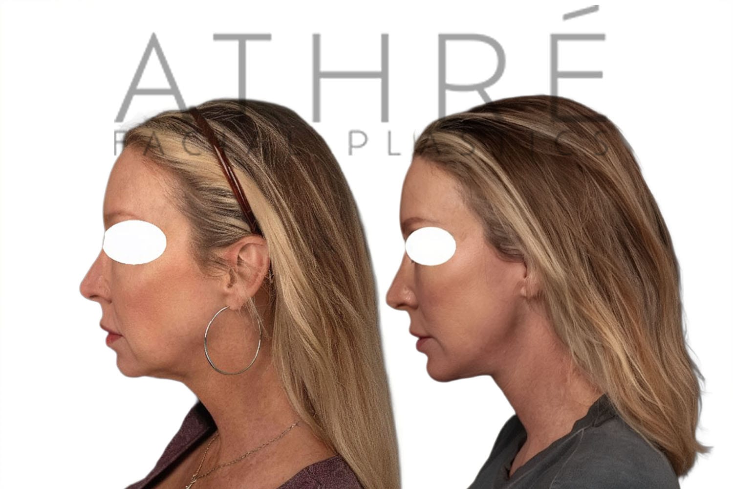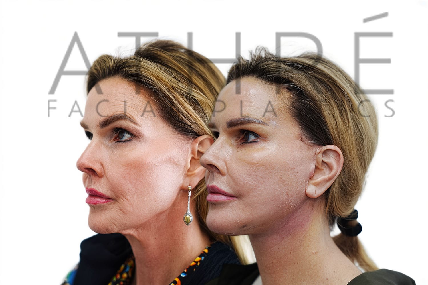 Female after deep plane facelift (4D Facelift ™), autologous fat transfer to face, deep neck lift, stem cell nanofat treatment, lip augmentation with fat, Right upper blepharoplasty, left upper revision ptosis repair with blepharoplasty.