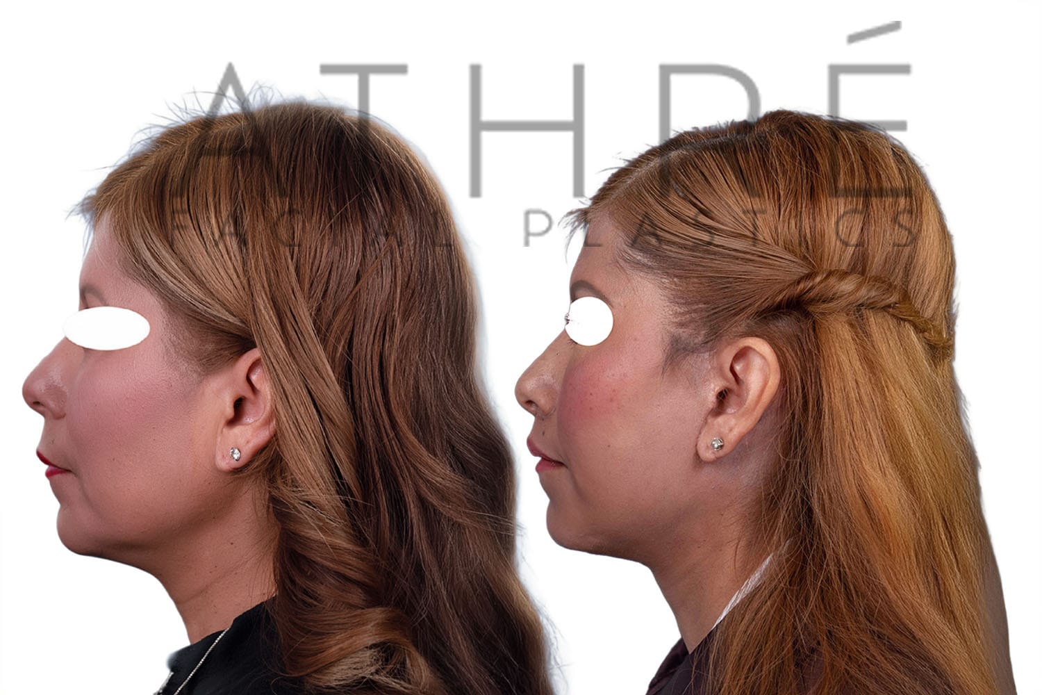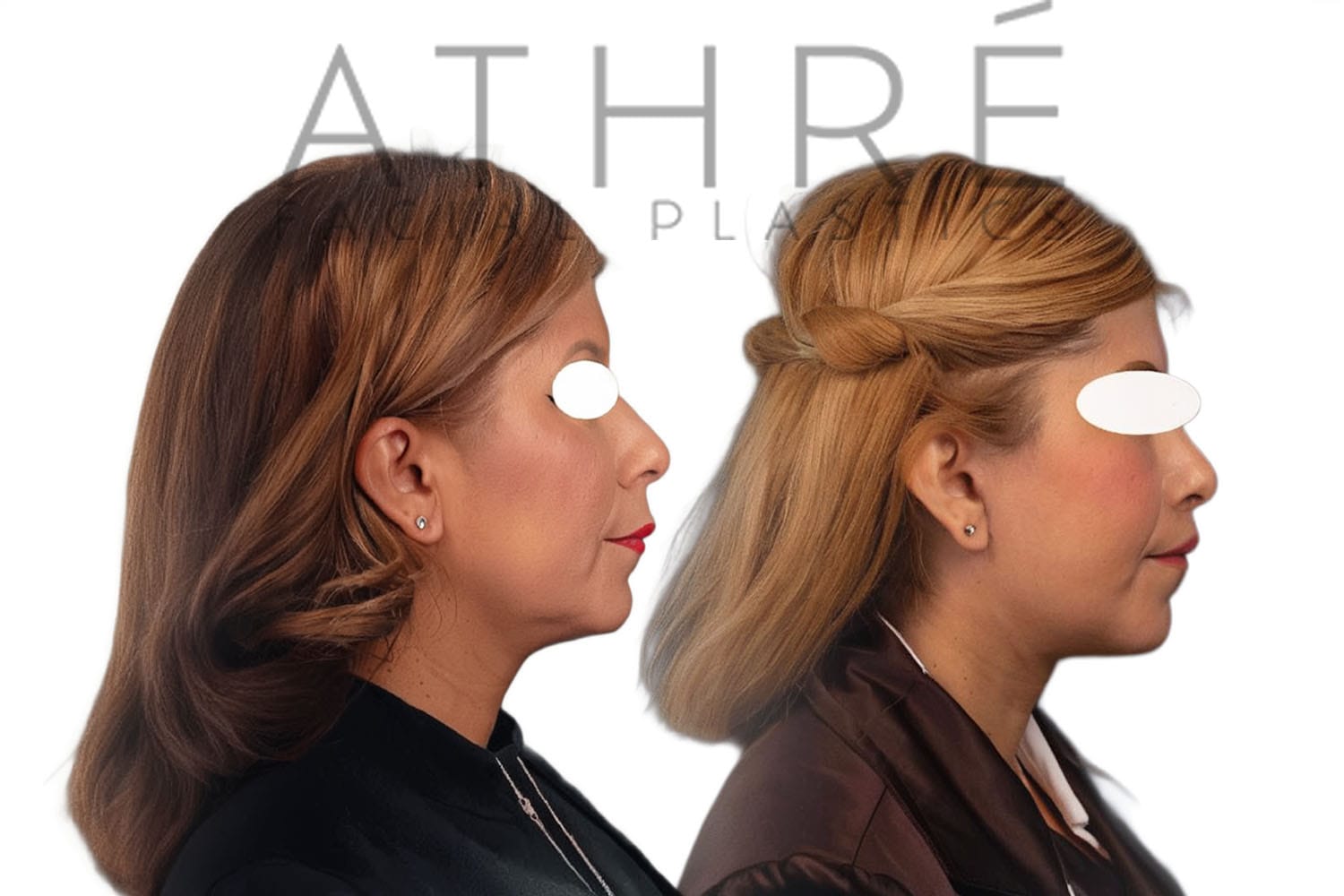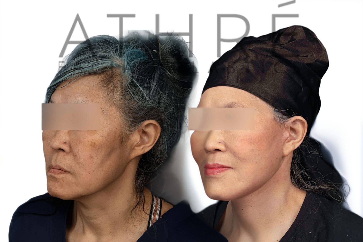 Female after deep plane facelift (4D Facelift ™), autologous fat transfer to face, deep neck lift, stem cell nanofat treatment, lip augmentation with fat, Right upper blepharoplasty, left upper revision ptosis repair with blepharoplasty.