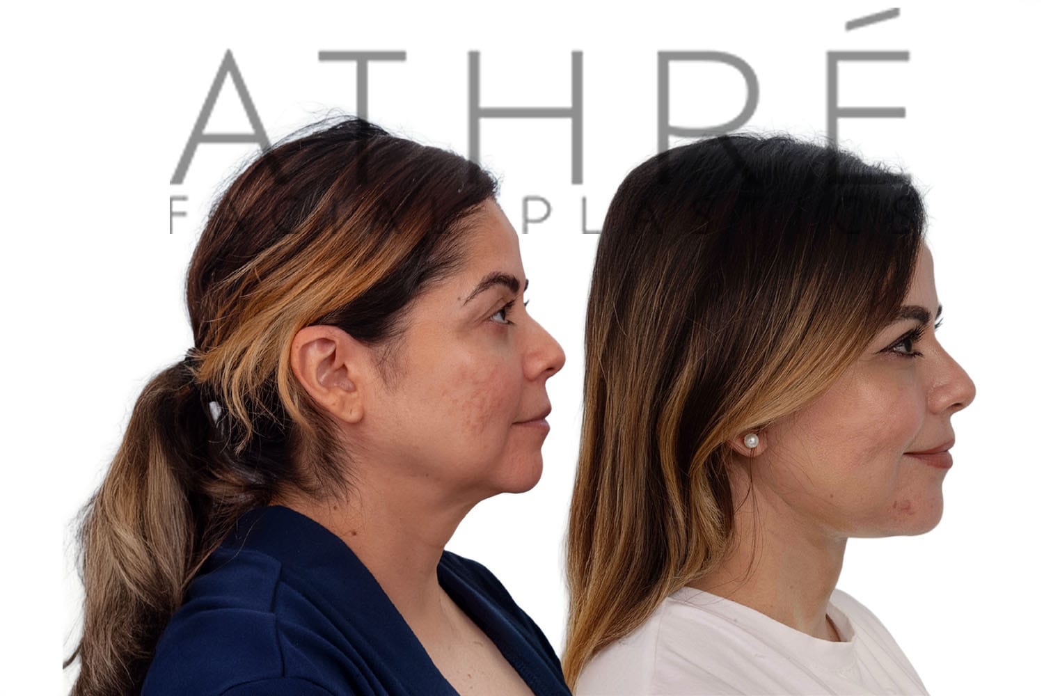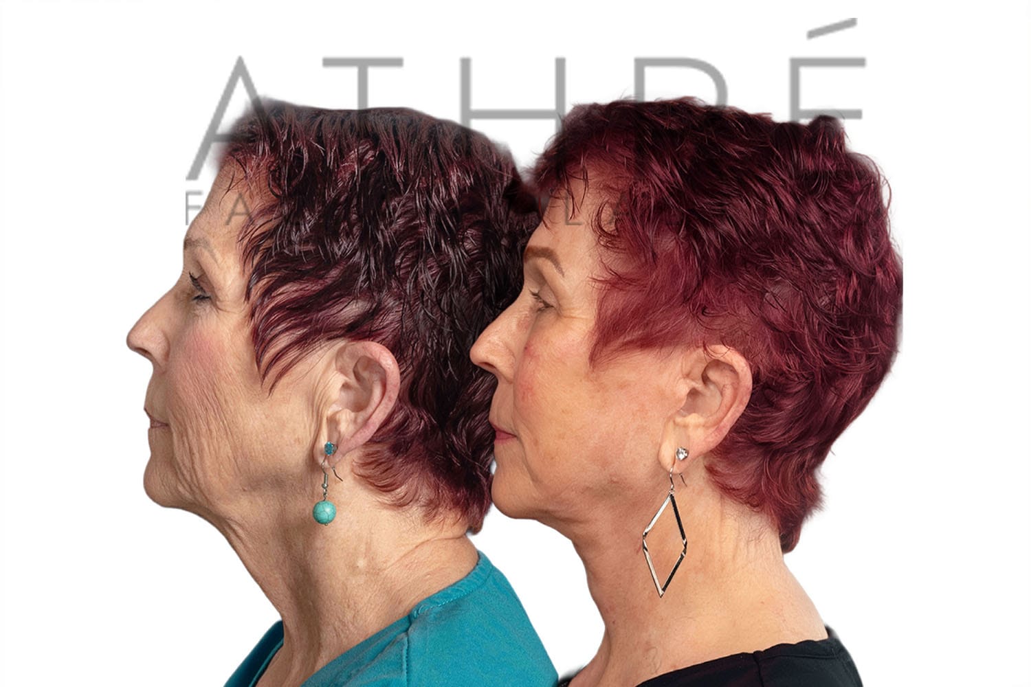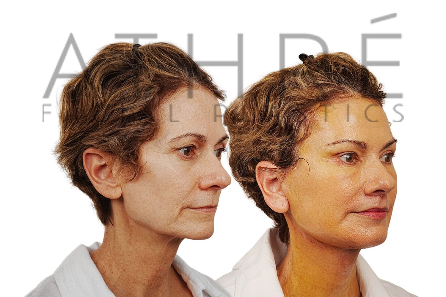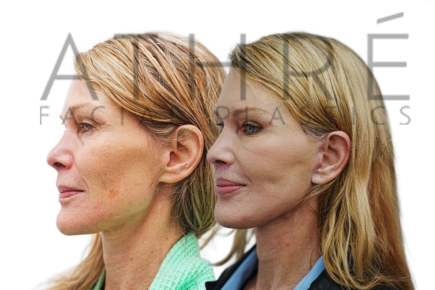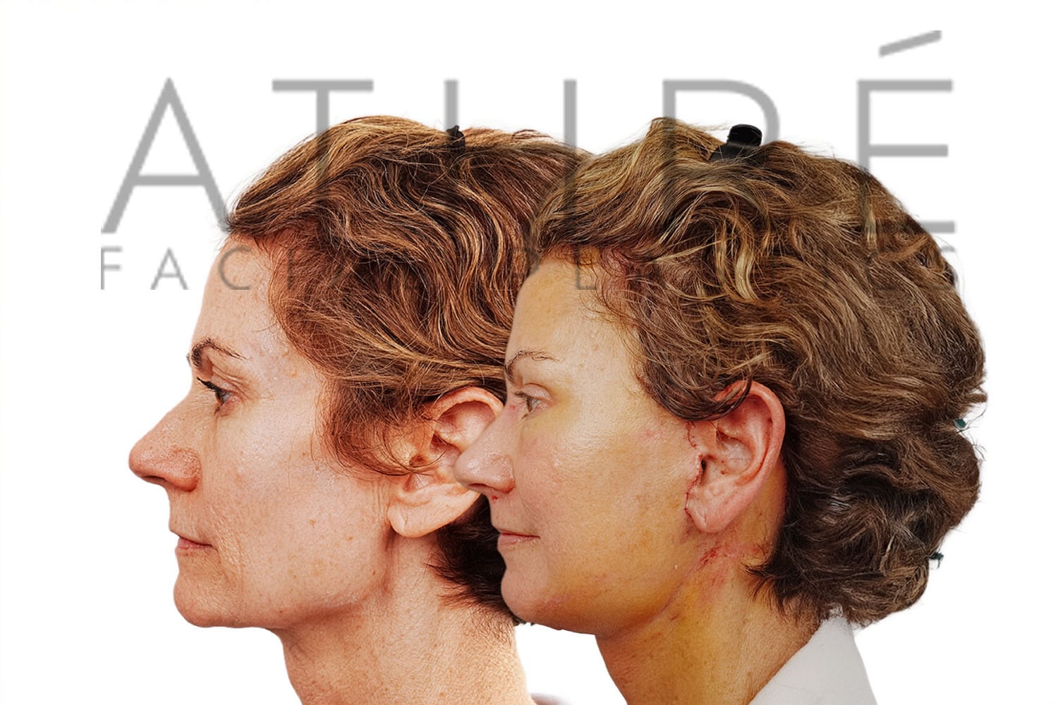 Female after deep plane facelift (4D Facelift ™), autologous fat transfer to face, deep neck lift, stem cell nanofat treatment, chemical peel full face.