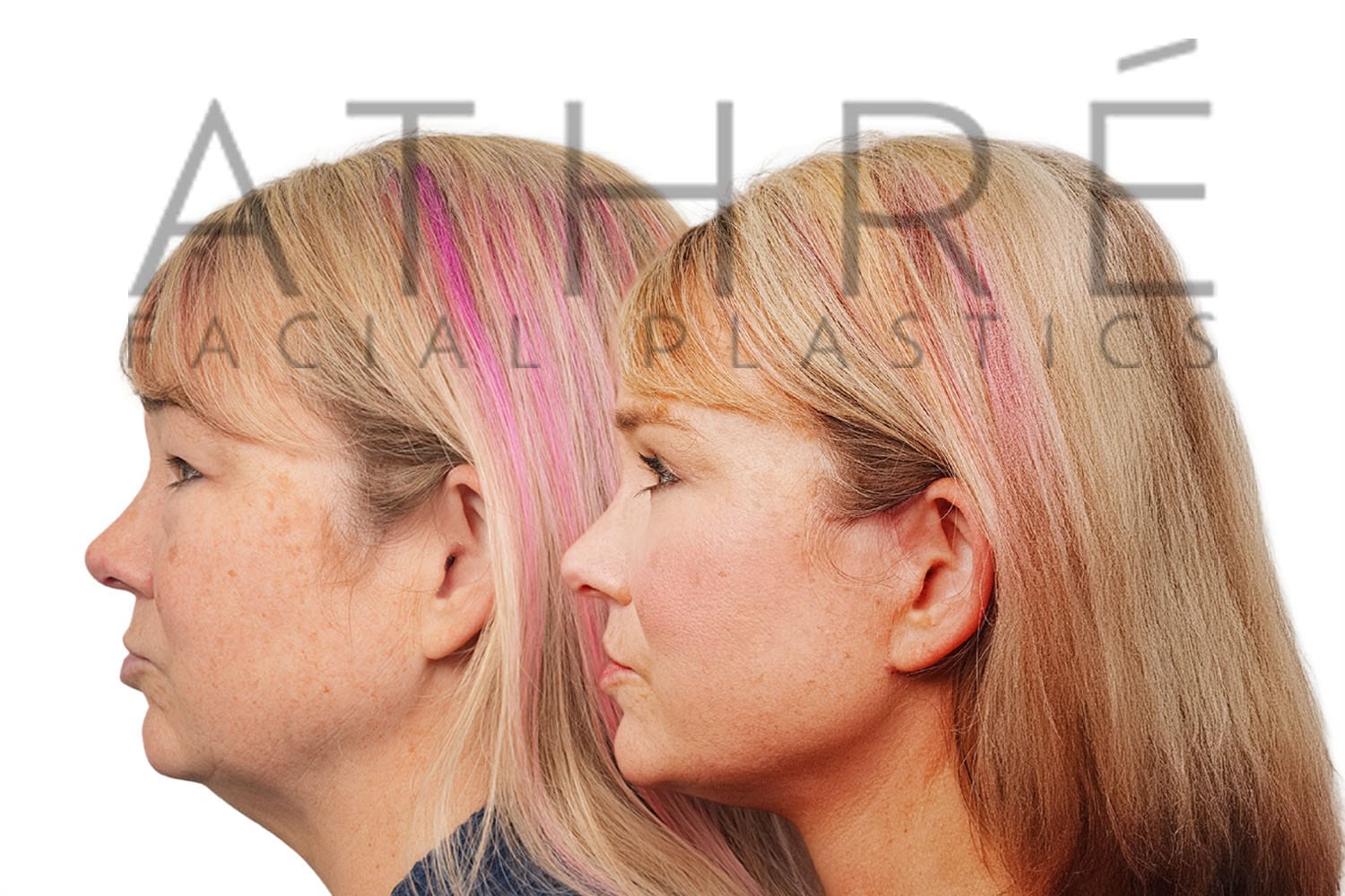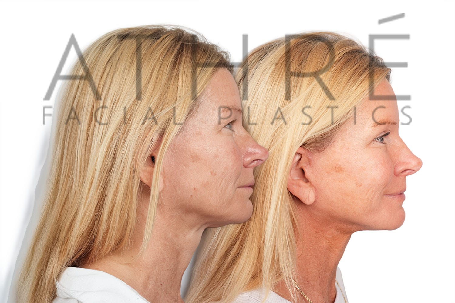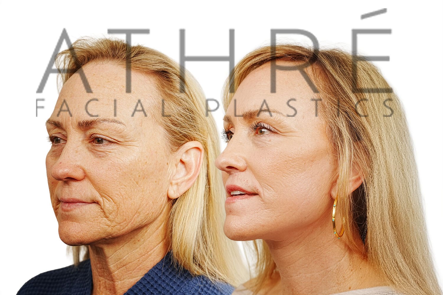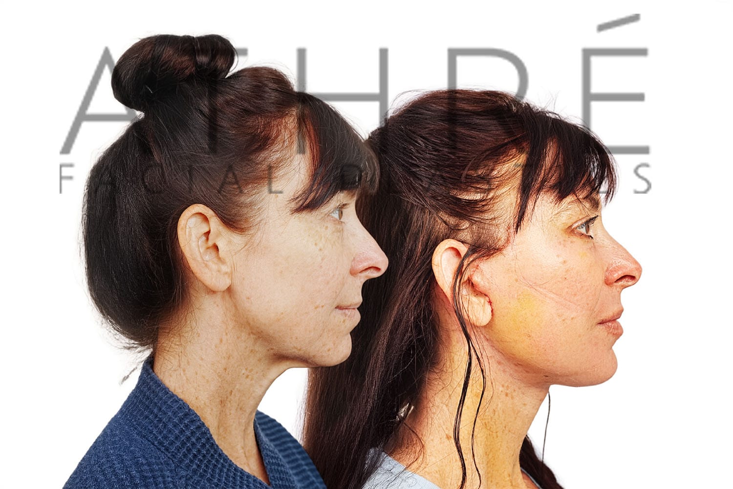 Female after deep plane facelift (4D Facelift ™), autologous fat transfer to face, deep neck lift, stem cell nanofat treatment, chemical peel full face.