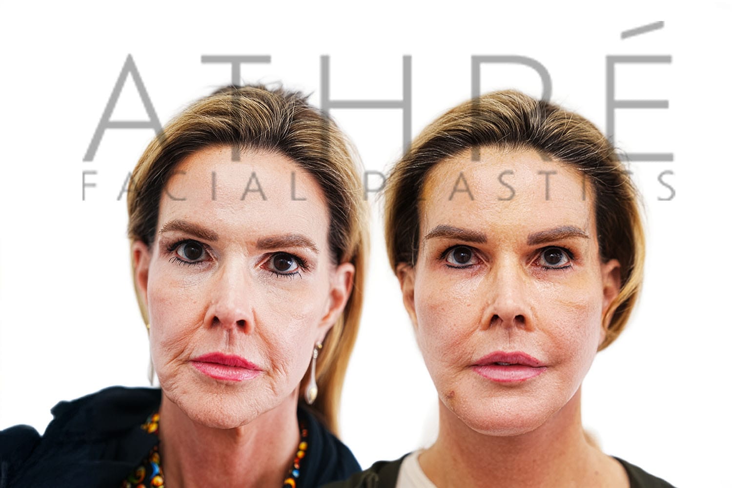 57 year old female after deep plane facelift (4D Facelift ™), autologous fat transfer to face, deep neck lift, stem cell nanofat treatment, brow lift, upper blepharoplasty, upper lip lift, lower lip lift, lower blepharoplasty subciliary, full face chemical peel.