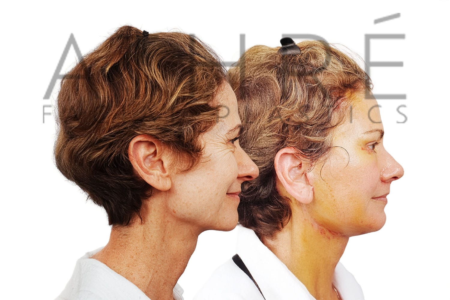 50 yo female underwent deep plane facelift (4D Facelift ™), brow lift, neck lift, autologous fat transfer to face, stem cell treatment to the face. Local anesthesia with oral sedation.